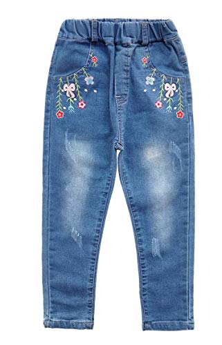 KIDSCOOL SPACE Pantaloni Jeans Ricamati da Bambina,Pantaloni con Fondo in Denim Elasticizzato in Vita da Bambina,Blu,6-7 Anni