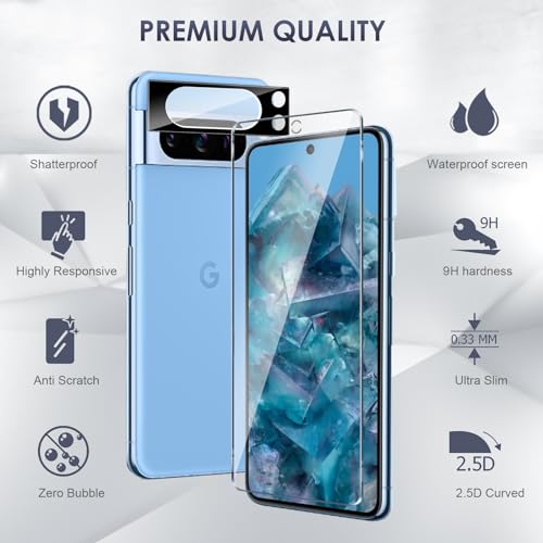 Kiewhay Pellicola Protettiva Compatibile con Google Pixel 8 Pro Vetro Temperato 6,7'', 3x Pellicola Vetro + 2x Pellicola Fotocamera, [NON per Pixel 8] 99,99% HD Pellicola Vetro - 5 Pezzi