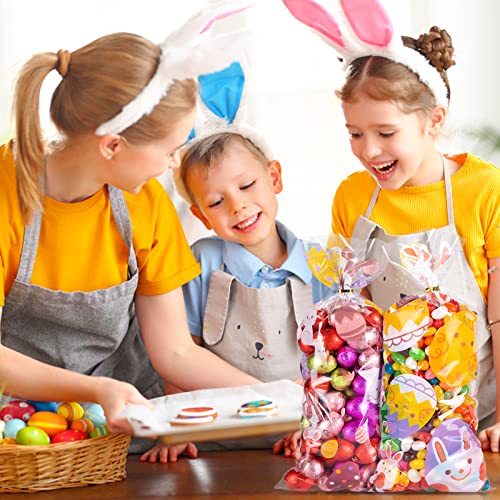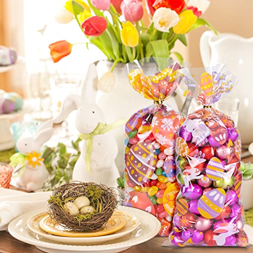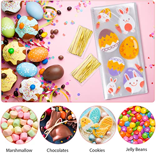 Kiiiwah 100 Pezzi Sacchetti Trasparenti Pasqua per Biscotti e Caramelle, Sacchetti Richiudibili Pasquali con Legami di Torsione per Decorazioni per Feste (4 Stili)