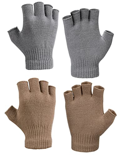 Kiiwah 2 Paia di Guanti Senza Dita Invernali Termici Unisex, Guanti Mezze Dita in Maglia Elastici Touch Screen per Uomo e Donna (Marrone Chiaro, Grigio)