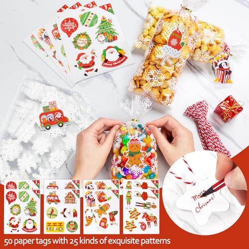 ❄️La Confezione Include - Riceverai 50 sacchetti trasparenti per confezioni di cellophane natalizio, 100 fascette, 8 etichette di carta e 50 corde sottili, che possono soddisfare le tue esigenze di confezionamento di regali e cibo.