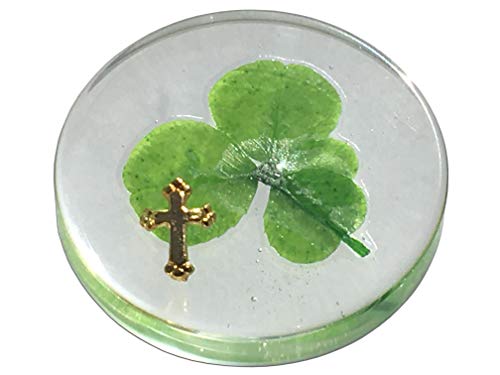 KIN-HEBI Vero trifoglio a quattro foglie, gettone tascabile di buona fortuna, conservato, 3.2 cm, Incluso oggetto a croce in metallo (Oro)