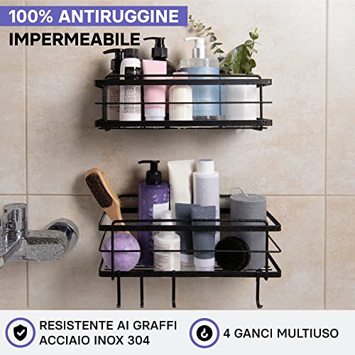 KINCMAX Mensola Doccia con Ganci in Set da 2 - Mensole Bagno per Spugne, Rasoi, Shampoo - Porta Bagnoschiuma da Doccia Adesivo - Resistente alla Ruggine (Nero)
