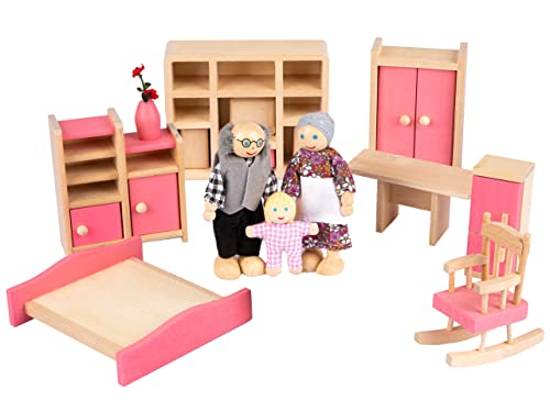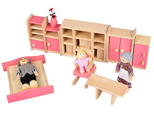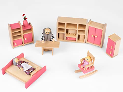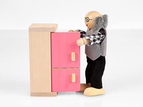 Kinderplay Set di Mobili Casa Bambole Legno - Set di Accessori Casa Bambole Legno di 11 Elementi, Include Bambole, Guardaroba, Cassettiera, Fiori. Figurina di Nonna, Nonno, Bambino, Modello GS1230