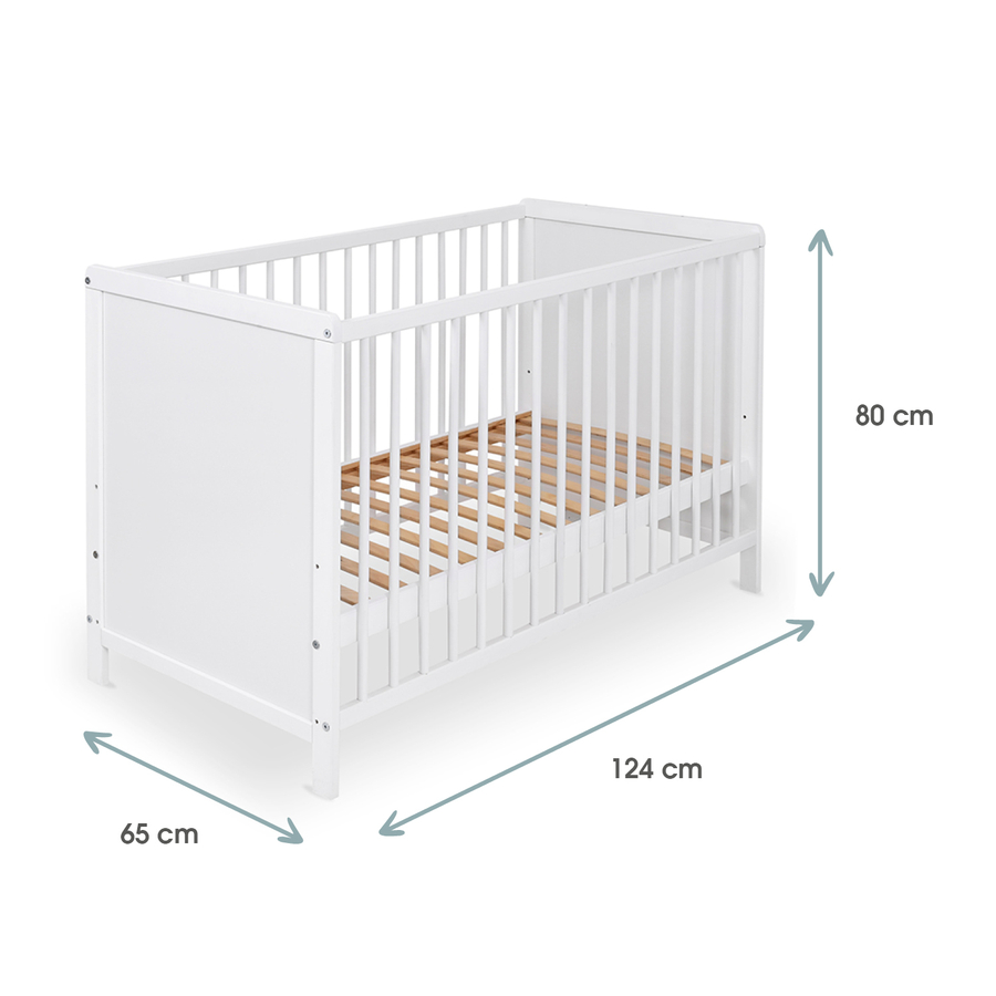 istruzioni di montaggio Dimensioni e peso: Letto: 65 x 124 x 80 cm (larghezza x lunghezza x altezza). Superficie di sdraio: 60 x 120 cm Distanza tra le barre: 5,5 cm Caricabile fino a 30 kg Materiale e cura: Telaio: Pino massiccio, smaltato Testata e pediera: HDF, smaltato Il letto per bambini certificato FSC® è realizzato con materie prime provenienti da una silvicoltura sostenibile e responsabile. Per la pulizia e la cura, utilizzare un panno umido e un detergente delicato, ad esempio una soluzione di sapone. La consegna include: Letto e rete a doghe Consegnato smontato per l'autoassemblaggio, le istruzioni di montaggio facili da seguire consentono un montaggio senza problemi Attenzione: decorazioni e materasso non inclusi nella consegna