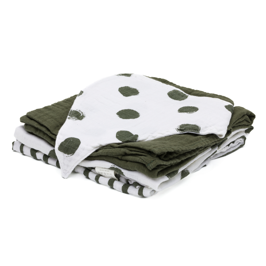 Dettagli del prodotto: Value pack: pratico set regalo nel colore oliva Set da 9 pezzi: composto da tre pannolini in mussola, tre panni triangolari e tre salviette per il bucato Extra morbido sulla pelle: morbido cotone prelavato di alta qualità con una grammatura di 120 g/m² Stabile nelle dimensioni: qualità del cotone resistente ai lavaggi Set ideale per il bambino: perfetto come regalo Certificato OEKO-TEX: Numero di test 11-36448 Shirley Dimensioni del pannolino in garza: 70 x 70 cm Dimensioni panni triangolari: 31 x 24 cm Dimensioni della salvietta: 15 x 20 cm Materiale e cura: Materiale: 100% cotone Lavabile fino a 40° C Adatto all'asciugatura in asciugatrice