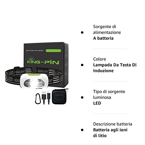 King-Pin Torcia Frontale Lampada Frontale LED Ricaricabile Torcia da Testa IPX5 Impermeabile Leggero 4 modalità Luce Frontale con Sensore per Corsa Camminare Pesca Notturna Campeggio Lettura