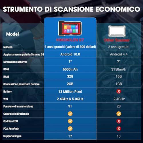 【Dispositivo diagnostico avanzato 2024】 RAM: 2 G, ROM: 32 G, batteria: 3150 mAh, sistema: Android 10.0, dimensioni: schermo LCD da 7", nuova fotocamera posteriore da 1300 W. Lo scanner diagnostico Kingbolen K7 aggiunge un sistema completo di diagnosi avanzate, registrazione dello schermo e diagnosi remota, per rendere più comodo e facile la riparazione della vostra auto.