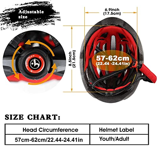 【Funzione taglia regolabile】Casco bici adulto con design regolabile a doppia vestibilità, pulsante regolabile sul retro e cinghie laterali consentono di indossare il casco bici da strada nella giusta posizione per regolare la circonferenza della testa. La misura regolabile 57cm-62cm (22.44''-24.41'') soddisfa le esigenze della maggior parte dei ciclisti uomini e donne.