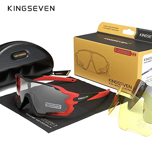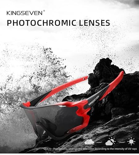 KINGSEVEN Occhiali da Ciclismo per Uomo Donna Bicicletta Sport MTB Occhiali da sole per Bici da Strada Lenti Fotocromatiche LS-911 (Rosso sfumato fotocromatico)