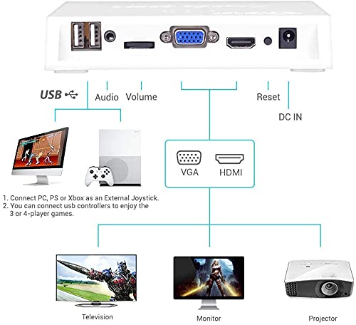 Con connessione HDMI e VGA, risoluzione 1028* 720P. Un grande aggiornamento con più giochi e sistema più stabile.