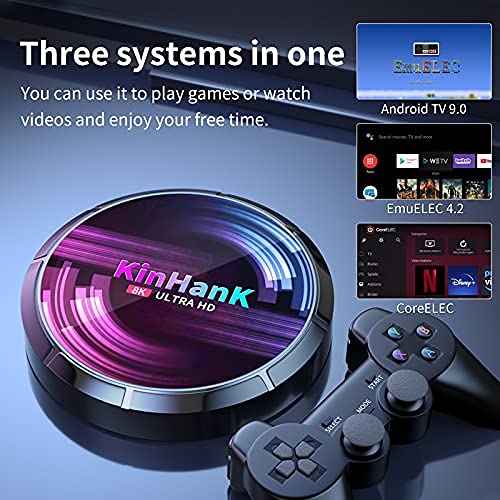 Super Console X Max tre sistema tutto in uno, Android TV 9.0+ ultimo sistema EmuELEC 4.2+CoreELEC, non solo gioca giochi classici retrò, giochi online, ma anche guardare film TV gratuitamente, navigare sul web, scaricare app, ecc., per soddisfare le esigenze di diversi utenti.