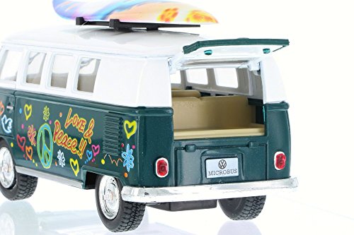 Kinsmart Volkswagen Classic Bus con tavola da surf & Hippy Flower Power Decor colore verde scala 1:32 modellino auto