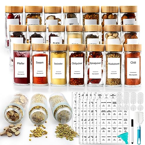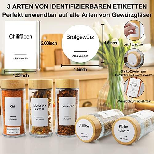 Contenitore completo per spezie: 24 barattoli vuoti per spezie con inserto in vetro rotondo con coperchi di bambù, 24 coperchi shaker, 398 etichette impermeabili per barattoli di spezie (136 etichette quadrate e 136 etichette rotonde sono prestampate + 34 etichette quadrate e 32 etichette rotonde vuote + 60 dati di scadenza), un imbuto pieghevole in silicone, un pennarello e un pennello. .