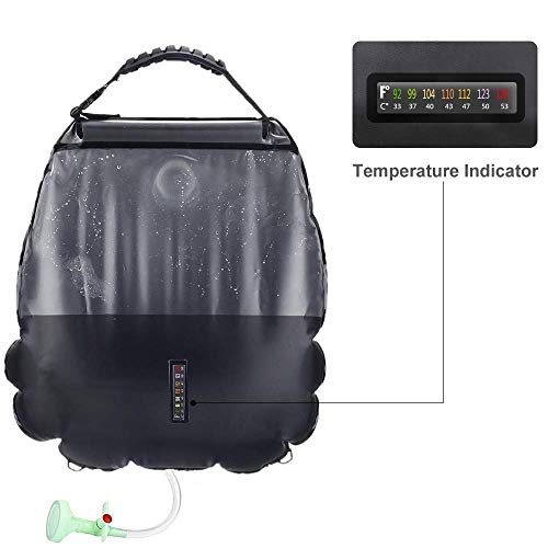 ☀Design intelligente che assorbe il calore: Doccia Solare Campeggio,la temperatura dell'acqua della doccia solare può raggiungere fino a 40 gradi con 3 ore di luce solare diretta. Sul retro della borsa da doccia da campeggio si trova un indicatore di temperatura. È possibile rilevare rapidamente la temperatura dell'acqua.