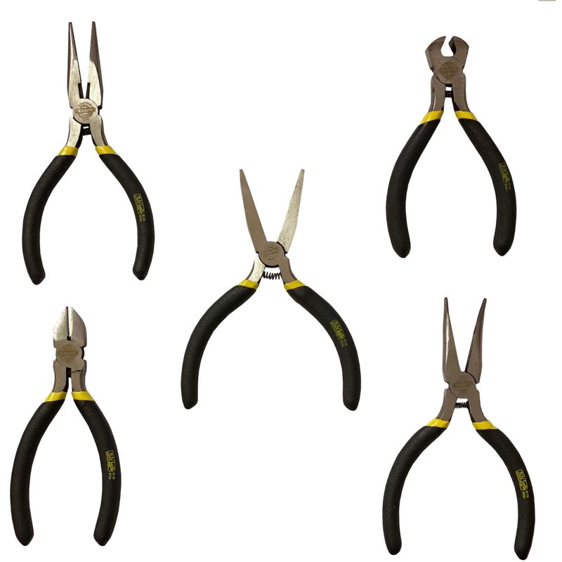 Descrizione Set da 5 pezzi di pinzette per la lavori di precisione. Il set comprende: tronchese taglio laterale, tronchese taglio frontale, pinza a becchi piatti, pinza a becchi semitondi e pinza a becchi semitondi curvi.