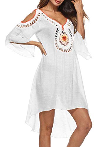 KIRALOVE Copricostume Donna Mare - Piscina - Pareo - Abito - Ragazza - da Bagno - Spiaggia Tunica - Bianco - Vestito - Decorato - Indiano - Ottima qualita