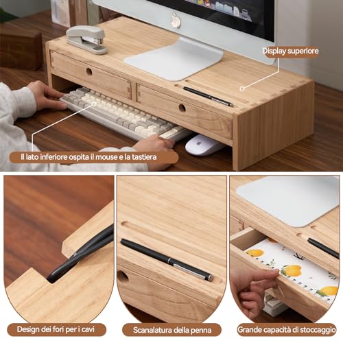 KIRIGEN Supporto per monitor in legno con 2 cassetti Riser per braccio per computer Organizzatore di archiviazione da scrivania, Supporto per stampante per laptop, Scaffale da scrivania a 2 livelli