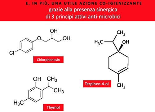 IGIENIZZANTE: Grazie all'esclusivo complesso antimicrobico Clorfenesina - Timolo - Olio Essenziale di Melaleuca Alternifolia (Tea Tree Oil) svolge una preziosa azione co-igienizzante delle mani