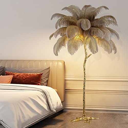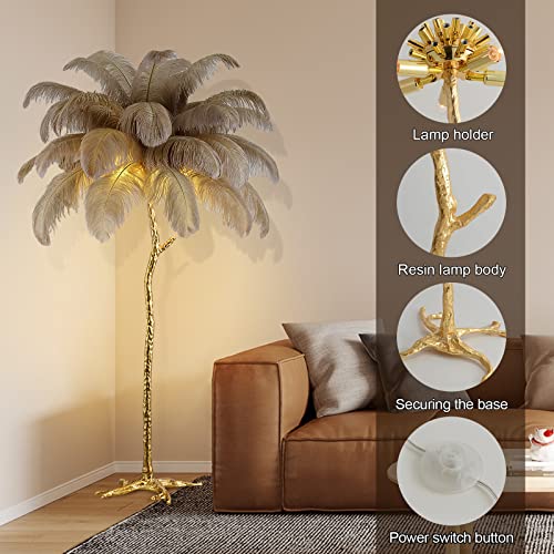 KISFWIU lampada da terra, lampada in piuma di struzzo Con paralume a 35 piume Palo per lampada in resina dorata grande lampada da terra Adatto per camere da letto e soggiorni 170 * 110 cm (brown)