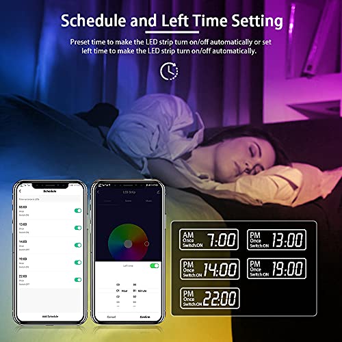 【Funzione di temporizzazione】 La striscia luminosa bluetooth ha una funzione di temporizzazione e una funzione di memoria. Puoi impostare l'ora di accensione e spegnimento automatico della striscia luminosa, ricorderà le tue ultime impostazioni di modalità, convenienti per il tuo prossimo utilizzo. Costruisci la tua casa intelligente da questa luce intelligente