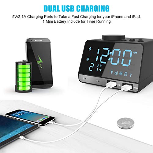 Presa di ricarica doppia USB: supporta 2 porte di ricarica USB, la sveglia digitale è dotata di protezione da sovracorrente, sovratensione e cortocircuito, per ricaricare il vostro cellulare, iPad e altri dispositivi USB. La batteria a bottone integrata (cr2302) può essere utilizzata per lo spegnimento di emergenza e offre anche una funzione di memoria per l'impostazione della sveglia.
