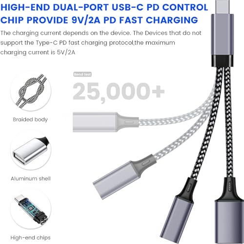 【Erogazione di alimentazione tramite cavo sdoppiatore usb】 La splitter usb to usb c adapter da 1 a 2 può fornire la funzione di ricarica durante il trasferimento di dati e il collegamento di più periferiche di piccola potenza. Questa ricarica splitter usb c è adatta a tutti e al telefono con porta di ricarica di tipo C.