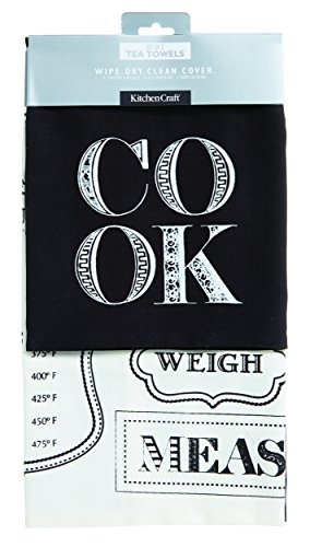 Decorato in nero con bianco con la parola "Cook in fantasie e un canovaccio bianco stampato con pesi e misure conversioni