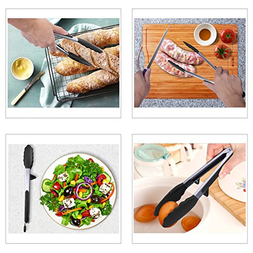 Kitchen Tongs Set, MANLEHOM Locking Heavy Duty Silicone Salad Tongs Stainless Steel with Built-in Stand for Food Cooking 2 Pack [9"+12"] Black