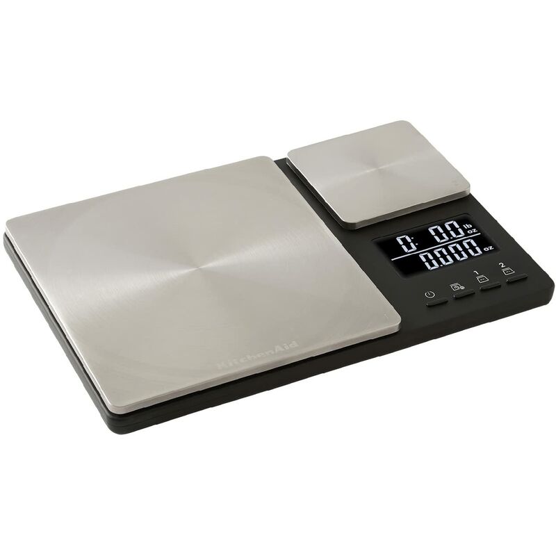 La bilancia per alimenti kitchenaid presenta un design a doppia piattaforma. Una superficie pesa quantità maggiori fino a 5000 grammi con incrementi di 1 grammo o 11 libbre con incrementi di 0.1 once e l'altra quantità inferiori, fino a 500 grammi con incrementi di 0.01 grammi o 16 once con incrementi di 0.001 once per ingredienti come lievito e spezie. Le due piattaforme di questa bilancia possono lavorare insieme o indipendentemente perché il display retroilluminato a doppia lettura mostra entrambi i pesi. Ogni piattaforma di pesatura ha una funzione di tara per azzerare i pesi dei contenitori per alimenti prima di inserirvi gli ingredienti. Le piattaforme in acciaio inossidabile sono facili da pulire, basta utilizzare un panno umido ed asciugare. Il design sottile permette di riporre facilmente la bilancia.