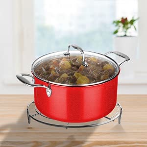 Versatile ed estremamente durevole: l'altezza di 2,5 cm della griglia rotonda garantisce un flusso d'aria ottimale e permette all'aria di circolare intorno a tutti i lati della padella, garantendo una cottura e un raffreddamento assolutamente perfetti. Da utilizzare in friggitrice ad aria calda, Instapot e come inserto per cottura a vapore. Utilizzabile anche come sottopentola per cibi caldi.