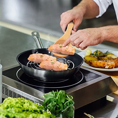 Robusta griglia rotonda in acciaio inox con tutti i pesi degli alimenti, senza che la griglia si pieghi o si pieghi e impedisce che i prodotti da forno sottili cadano attraverso le fessure. Sicuro in forno fino a 302˚C. Non c'è bisogno di girare il cibo durante la preparazione. Otterrete piatti croccanti e succosi di carne e verdure, senza sudare. Ideale per raffreddare torte, biscotti, pane e cupcake.