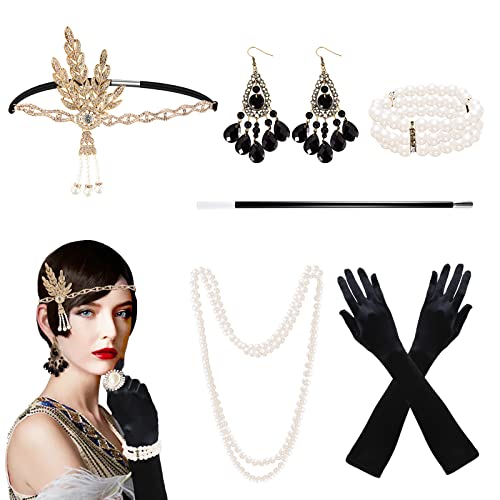 Kitimi Accessori Costume Anni 20 Donna, 6 Pezzi Accessori Charleston Donna Anni 20, Gatsby Accessori Donna con Fascia, Guanti Lunghi Collane e Orecchini, Anni 20 Accessori per Costume Carnevale Natale
