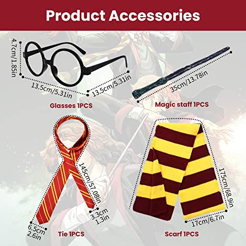 【Wizard Costume Set】Il set comprende mantello, cravatta, sciarpa, bacchetta e occhiali neri rotondi. Indossa questa tunica da mago e diventa un membro della scuola di magia. Si prega di leggere attentamente la tabella delle taglie sull'immagine del prodotto prima di ordinare.