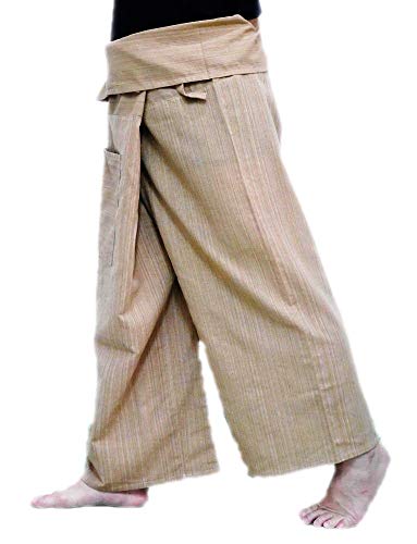 Thai pescatore pantaloni hanno una vita molto ampia con una cintura che lega dalla parte posteriore. Semplicemente passo in pantaloni, tirare la vita fuori da un involucro di lato il tessuto supplementare intorno alla parte anteriore e legare la cintura. Lunghezza può essere regolata piegando sopra la parte superiore dei pantaloni!