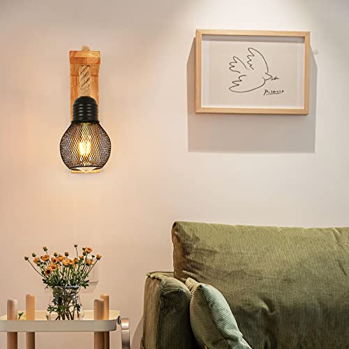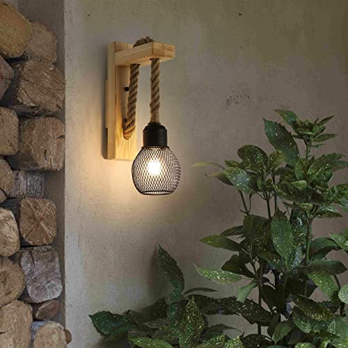Kiwaezs lampada da parete Vintage,applique da parete interno Legno Rustico,applique da parete in corda di Canapa,applique piccole con Paralume in Metallo Nero,applique camera da letto