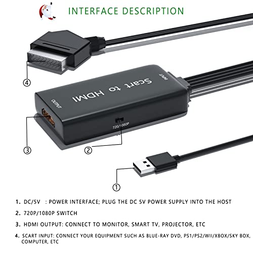 Kiyicjk Convertitore da SCART a HDMI, convertitore audio e video 720p/1080p con cavo HDMI e adattatore USB per HDTV, DVD Blu-Ray, monitor, proiettore, STB, VHS, PS1/PS2