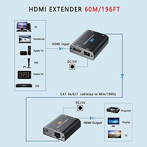 Extender HDMI da 196 piedi / 60 m: con un singolo cavo CAT5e/6/7 di alta qualità, puoi estendere i segnali audio / video HDMI contemporaneamente tramite cavo HDMI all'extender Ethernet, distanza massima fino a 60 m, stabile, chiaro e fluido. Conformità allo standard HDMI 1.3. (Si consiglia di utilizzare un cavo Cat5e / Cat6 / Cat7 ad alte prestazioni per garantire prestazioni affidabili)