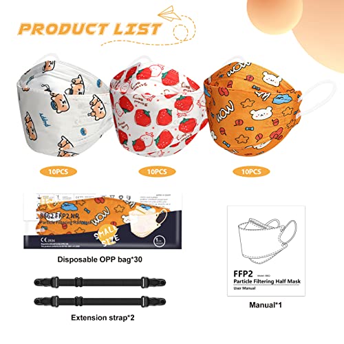 【Portatile】La confezione contiene 30 maschere protettive FFP2 con sigillo igienico sigillate singolarmente, puoi metterle nella borsa per uscire, più igieniche e più sicure. Ci sono tre modelli di cucciolo, fragola e piccolo dinosauro.Non applicabile agli adulti.