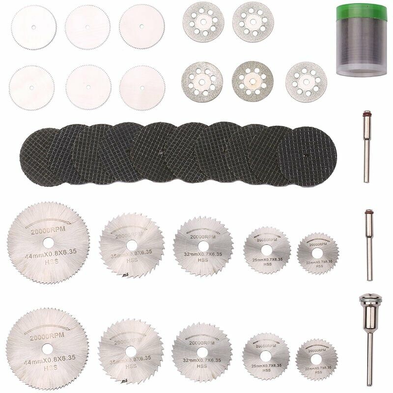 Caratteristiche: 5 tipi di lame da taglio - Il set di dischi da taglio per utensili rotanti include 30 mini dischi da taglio in resina, 10 dischi da taglio rinforzati con resina, 5 dischi da taglio diamantati, 6 seghe da taglio per legno semi-HSS, 12 dischi da taglio HSS e 4 * mandrini. Soddisfa tutte le tue esigenze di lavoro (taglio, scanalatura e rifilatura) Ottimo strumento per la casa e l'hobbista fai-da-te - Adatto per la maggior parte delle smerigliatrici elettriche o utensili rotanti e utensili pneumatici. Può essere applicato su legno, plastica, fibra di vetro, rame, alluminio e lamiera sottile, metallo tenero, ecc. Uno strumento indispensabile per il lavoro di intaglio. Disco da taglio diamantato - Con elevata efficienza di taglio, lunga durata, qualità stabile, ecc., Sono molto adatti per il taglio, la giada e il vetro. Sostituisci con una piccola impugnatura della ruota di taglio / Ideale per gli appassionati di fai da te. Rotella da taglio in resina - Con una bassa