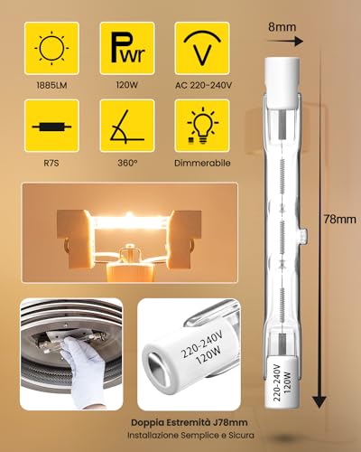 【78mm R7s Alogene】Lampadina lineare a doppio attacco di tipo J, base R7s, Φ8*78mm, 120W, 2800K, 1885 lumen, apertura del fascio a 360°, AC 220-240V. Sostituzione diretta per tutti i portalampade T3 78mm r7s a doppia estremità.
