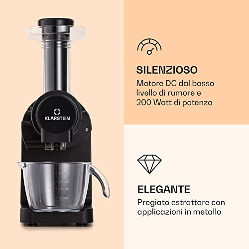 Klarstein Bella Elegance - Centrifuga per succhi di frutta, 200 W, 400 ml, senza BPA, base antiscivolo, funzionamento continuo massimo: ca. 20 minuti, facile da pulire, nero