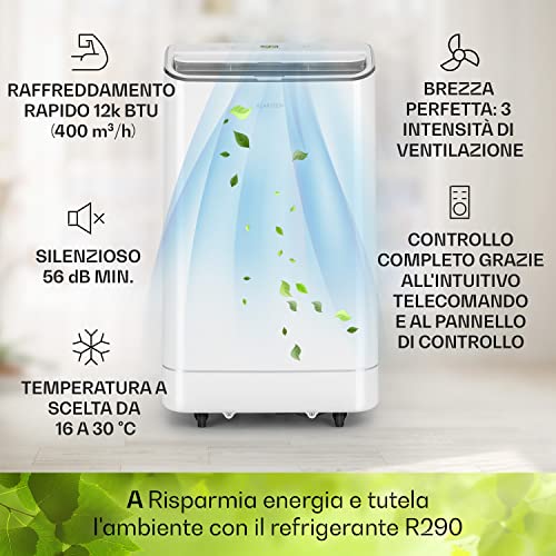 ESSENZIALE 4-IN-1: Il nostro condizionatore portatile rinfresca giorni afosi grazie ai suoi 12000 BTU/3.5 Kw di capacità. Scegli tra quattro modalità: raffreddamento, night mode, ventilazione o deumidificazione per massima difesa contro l'umidità