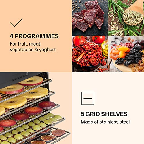 Klarstein Florida Jerky - Apparecchio Disidratatore, Essiccatore, 500W, Infrarossi, Display LCD, 4 Programmi per Frutta, Carne, Verdura e Yogurt, 5 Ripiani in Acciaio Inox, Filtro Aria, Nero