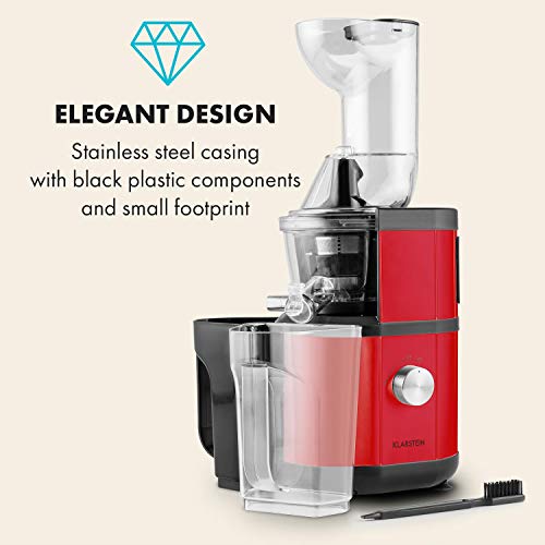 Klarstein Fruitberry - spremiagrumi verticale, mini-setaccio acciaio inox, 400 W, 60 U/min, pressa elica, 2 contenitori 1000 ml, silenzioso, protezione start/stop, plastica, rosso