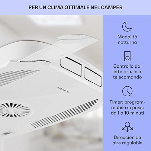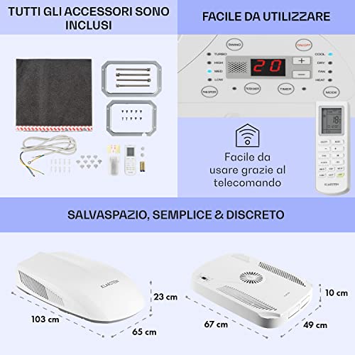 FACILE E FLESSIBILE: accensione e spegnimento sul pannello di controllo o sul telecomando. Condizionatore d'aria split con funzionamento di scambio del calore. Dispositivo interno adatto a montaggio sul tetto di roulotte/camper.