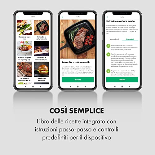 SEMPLICE: il circolatore rende l'utilizzo ancora più semplice e assicura risultati gourmet. Il controllo con app Klarstein per Android e iOS permette di controllare il processo e vi accompagna passo per passo con il suo libro di ricette integrato.