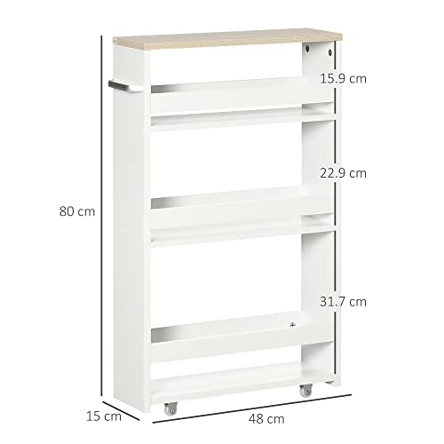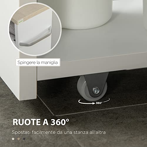 Kleankin Carrello da Cucina a 3 Ripiani Salvaspazio, Mobiletto Bagno con Rotelle e Maniglia in Legno per Bagno, 48x15x80cm, Bianco