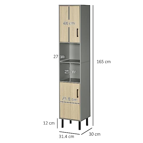 Kleankin Colonna Bagno con 2 Ripiani Aperti in Truciolato e 2 Armadietti con Ripiani Regolabili, 31.4x30x165cm, Grigio e Color Quercia