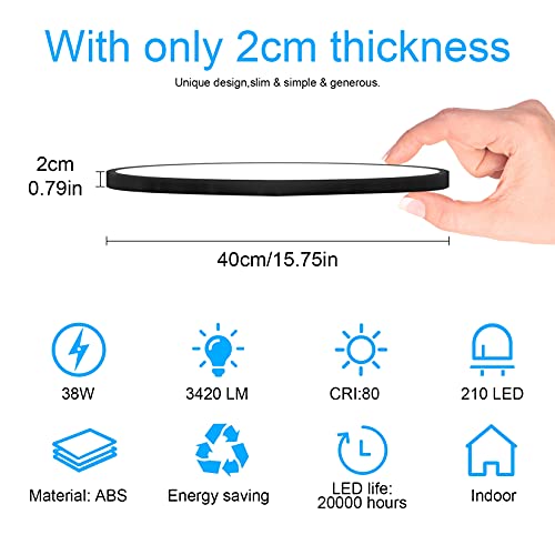 Klighten Plafoniera LED Soffitto Moderna 38W 3420LM, Lampada da Soffitto Tonda Pannello LED Luce Soffitto per Cucina, Soggiorno, Camera, Corridoio, Ø40cm × H2cm, Bianco caldo 3000K, Nero